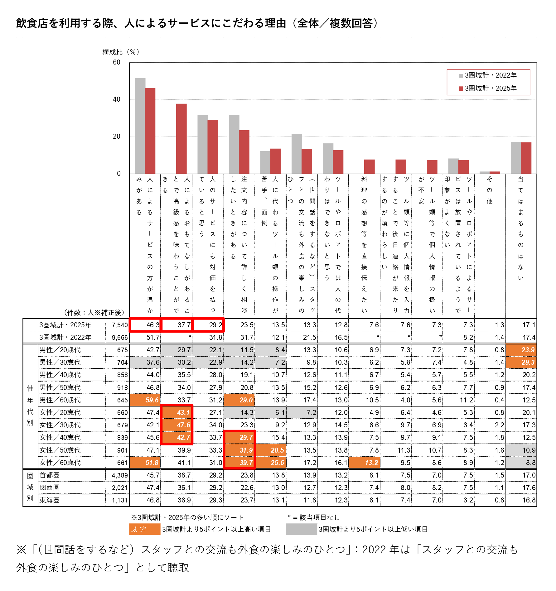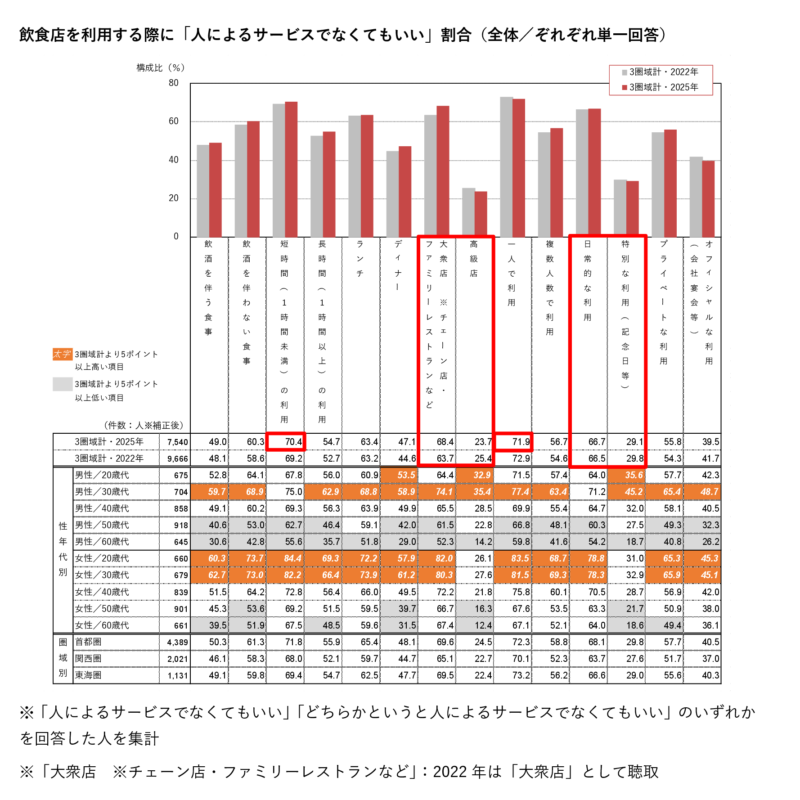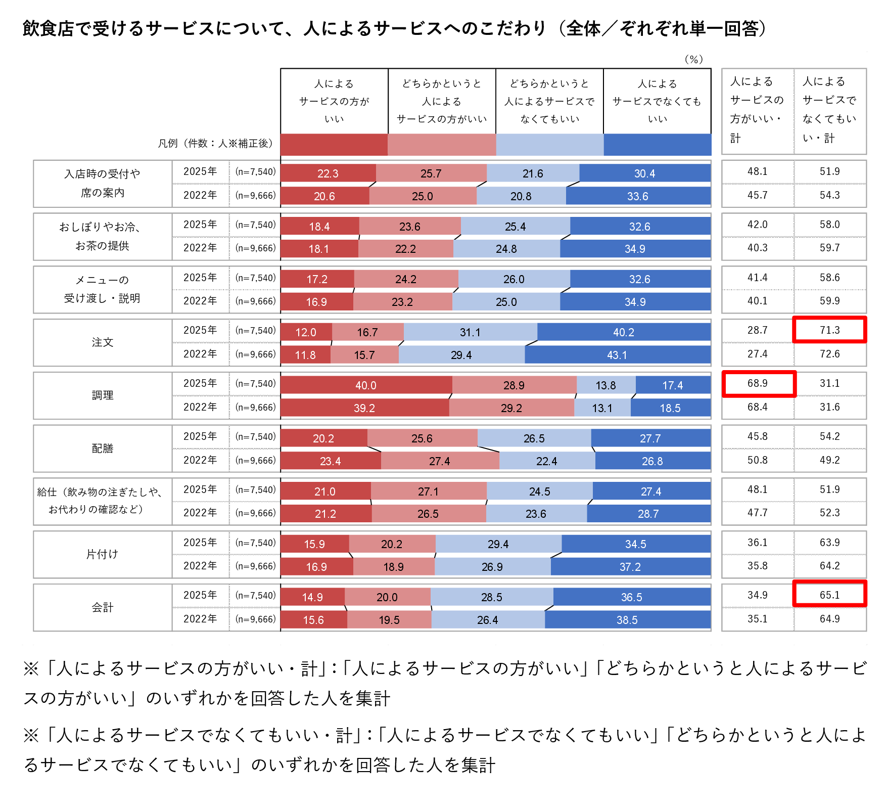 一方で、「人によるサービスでなくてもいい・計」の割合が最も高かったのは「注文」の71.3%となり、次いで「会計」(65.1%)だった。同総研では、「ともにデジタルツールの活用が進んでいる分野である。過去の調査(2022年実施)と比べると『人によるサービスの方がいい・計』の数値が微増している項目が多く、人によらないサービスが普及したことが、かえって人によるサービスの価値を高めている可能性もありそうだ」と分析した。
