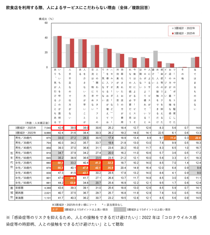 一方、「人によるサービスにこだわらない理由」では、「いちいち人を呼ぶのが面倒であり、気が引けることもある」(42.6%)、「人手不足なので仕方がない」(39.0%)、「人を介さない方が早いことがある」(38.0%)がトップ3となり、前回調査とは2位と3位が入れ替わった。