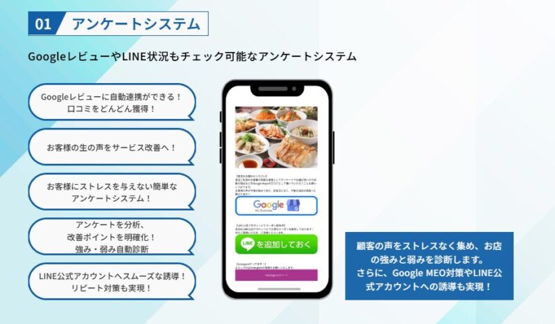 同サービスでは、まず、お客さんからストレスなくアンケートの回答を得られ、その内容を即座に店舗改善やGoogleレビューに反映できるほか、公式LINEへの誘導もスムーズにできる「アンケートシステム」や、スタッフの定着化の軸となる評価のブレを排除し公平・透明な指標で評価するとともに、グラフや点数で直感的に自身のスキルを把握できるためモチベーションアップにもつながる「スキルチェックシート」、簡単なチェックシートの入力でリアルタイムに店舗状況を把握・評価できる「QSCチェック」、開店準備に必要な多くの工程をチェックシートで確認しながら進められるように仕組み化し、アルバイトだけでも準備できるようにした「デイリーチェックシート」などを利用できる。