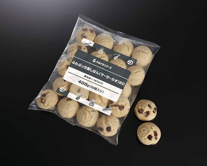 和洋中のジャンルを問わず採用でき、子供から高齢者まで幅広く楽しめ、ベーカリーとしてもクリームやフルーツを乗せたスイーツとしても利用できる上に、冷凍パンに比べて彩りがあり焼成する手間も必要ないというメリットがある蒸しぱんに着目。蒸し器や電子レンジで温めるほか自然解凍でも利用でき、必要な分だけを取り出せるピロー包装としたことで、人手不足対策や食品ロス削減にも寄与できるとしている。