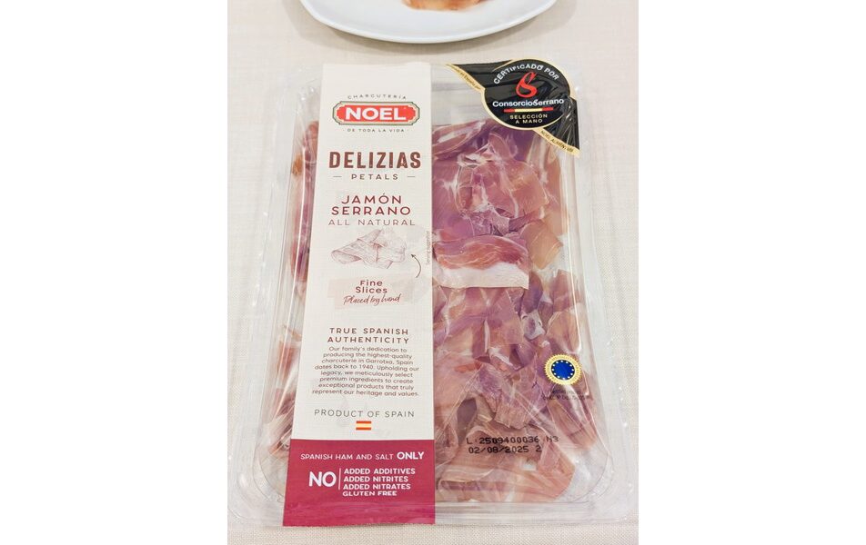 さらに、機械によるスライス工程では、パック製品の脂肪と肉の比率が均一になるように自動制御する。例えば60gのパックで脂肪分は20%という目標で脂肪の割合が少ない場合、機械が自動的に厚くスライスして調整する。「この制御により、消費者がハモン・セラーノを食べた時に、常に同じ比率の脂を摂取できるようにしている」という。製品によって厚みや枚数が異なることがあるのは、このためだ。