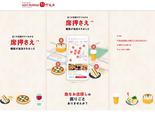 〈ホットペッパーグルメ〉に掲載し予約機能を利用している飲食店が対象で、「レストランボード(予約台帳)」にある「席押さえ」機能をオン・オフするだけで利用できる。ユーザーは無料で利用でき、店側も追加料金がかからないサービスとなっている。