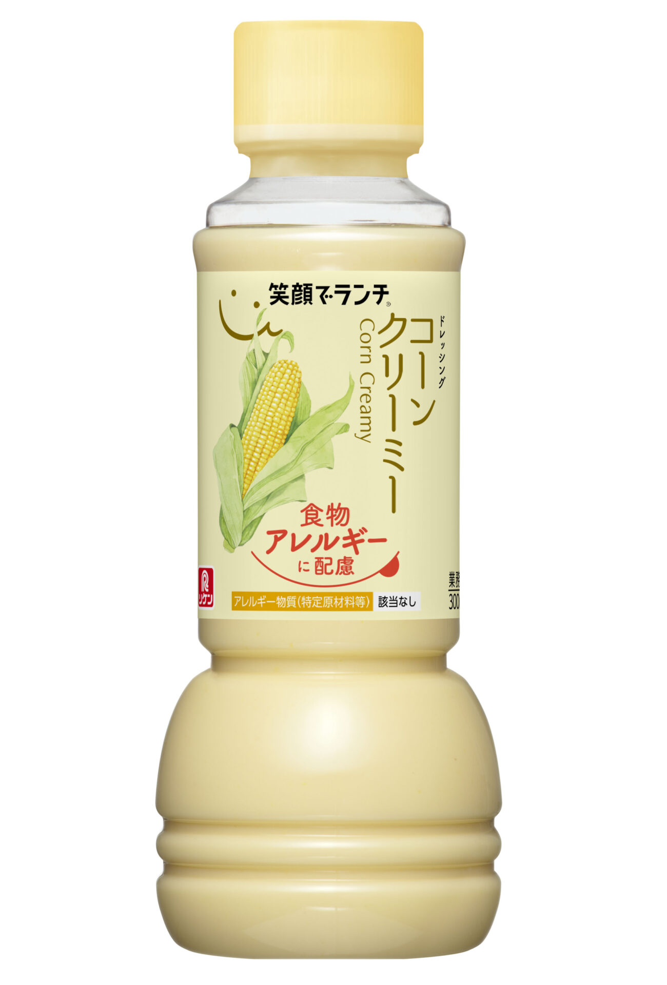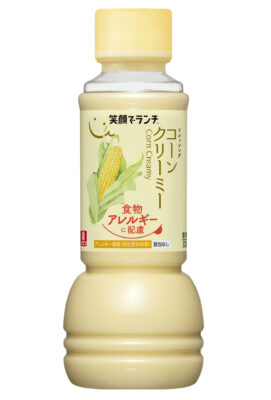 今回投入するのは〈笑顔でランチ ノンオイルドレッシング 青じそ〉と〈笑顔でランチ ドレッシング コーンクリーミー〉、〈同 減塩和風〉、〈同 イタリアン〉、〈同 香りごま〉(アレルゲンとなるごまを使用)の5品。それぞれ200ml・300ml・1Lの3規格を揃える。