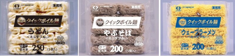 〈うどん〉は国産小麦粉を使い弾力と粘りがあるなめらかな味わいに仕上げ、〈ウェーブラーメン〉はスープののりが良く、〈やぶそば〉はハリのある麺とした。解凍時間は〈うどん〉が約30秒、〈ウェーブラーメン〉と〈やぶそば〉が約10秒となる。